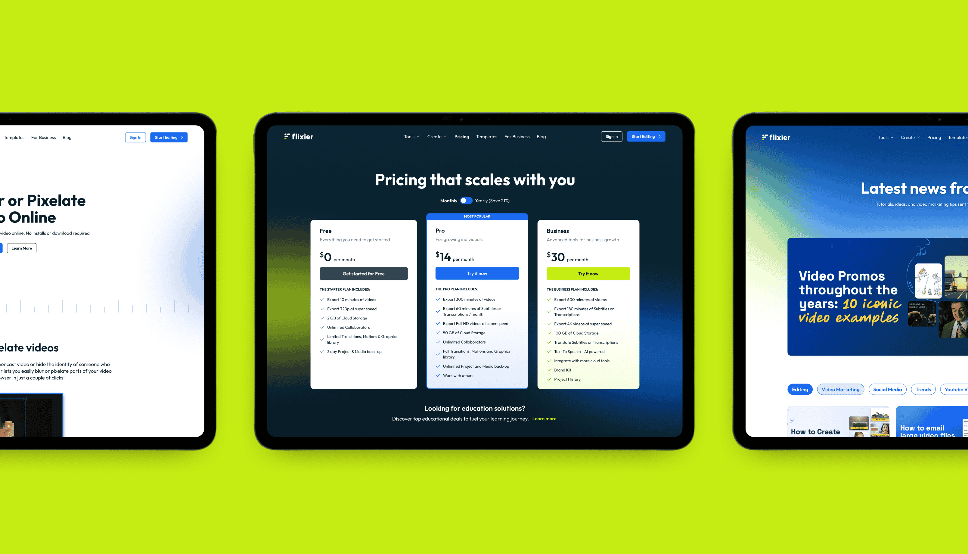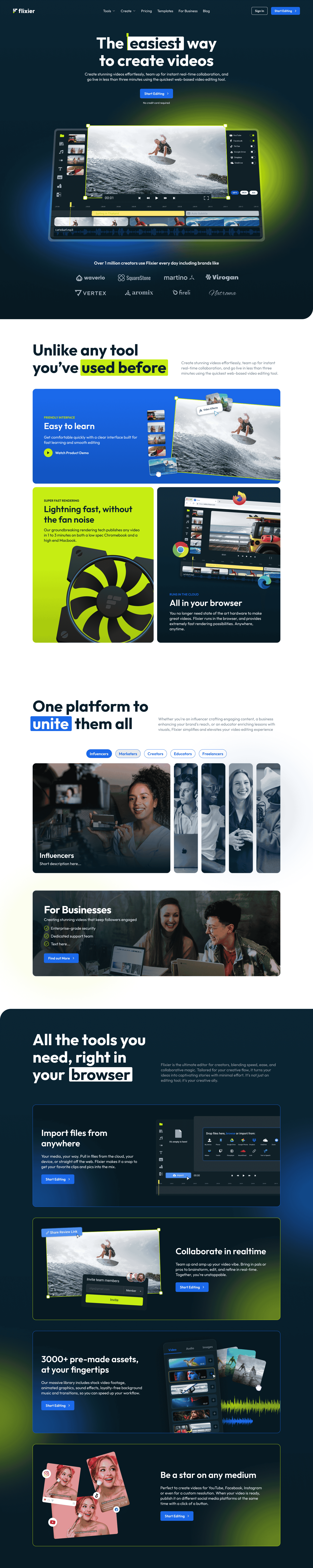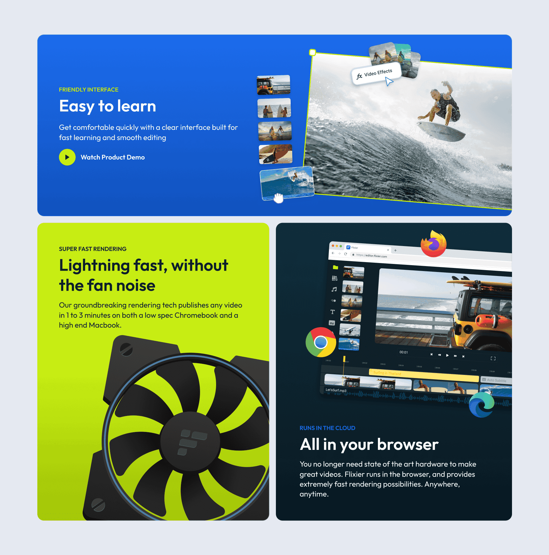We redesigned Flixier’s website in 2024 in collaboration with JustMad, translating their new branding direction into a fresh digital experience. In just 4 weeks, we reworked the design and adapted the user flow to better align with their new ICP, creating a clearer and more cohesive website experience.